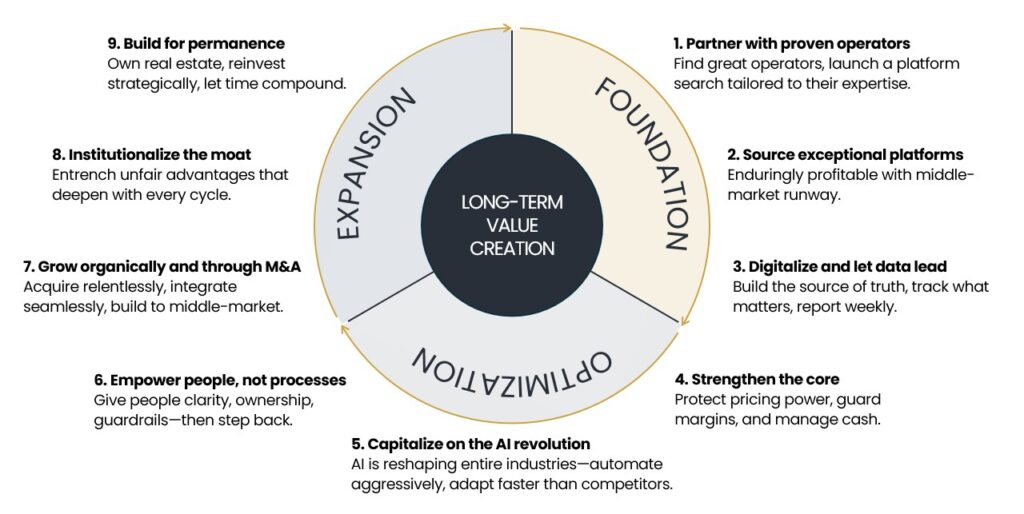 We partner with proven operators to build enduring businesses. The Lab One Value Creation Engine captures what we’ve learned over decades in private equity and as operators—not by chasing quick wins, but by compounding disciplined decisions over decades. Each principle builds momentum for the next, creating a self-reinforcing system of value creation.